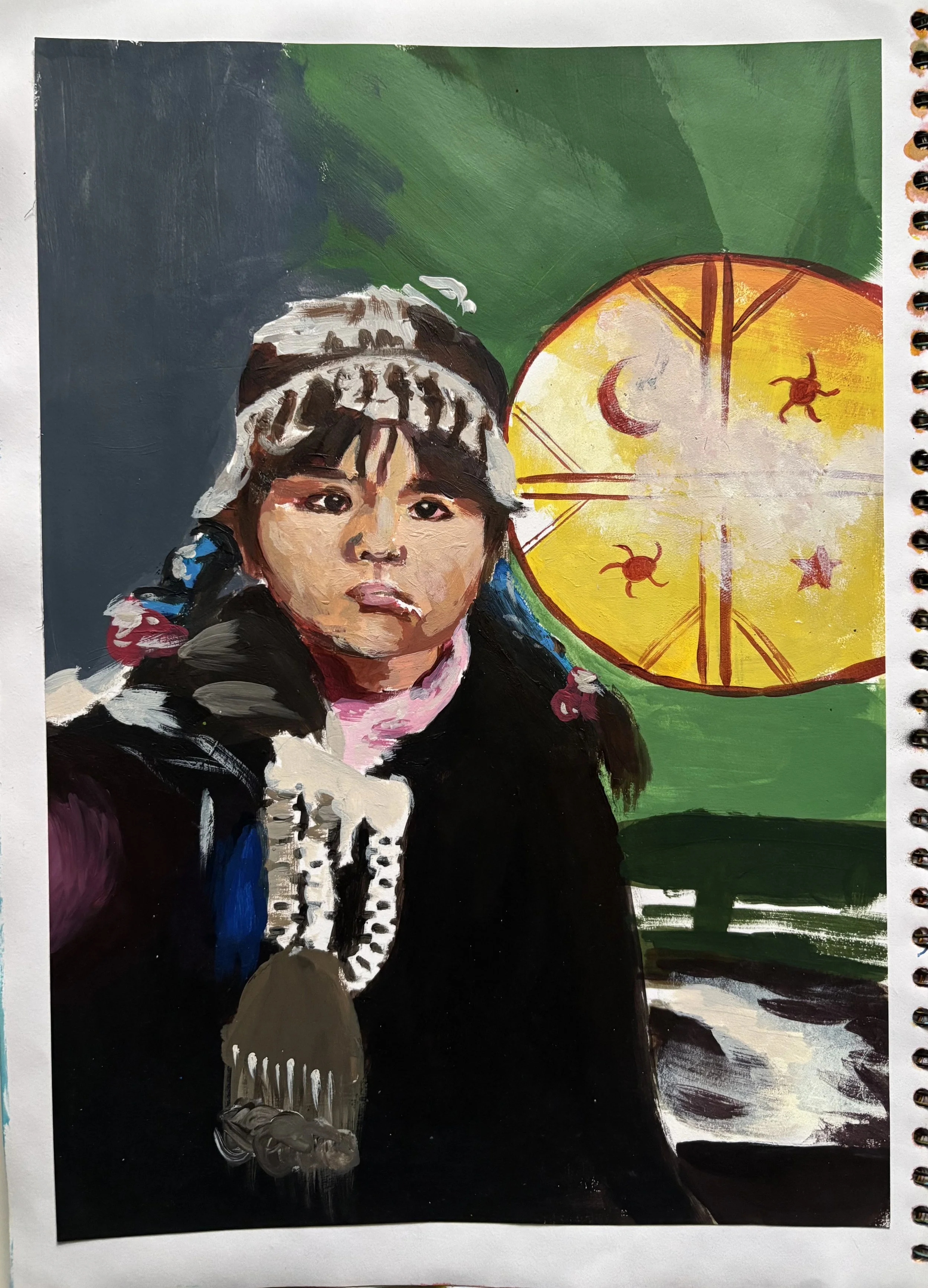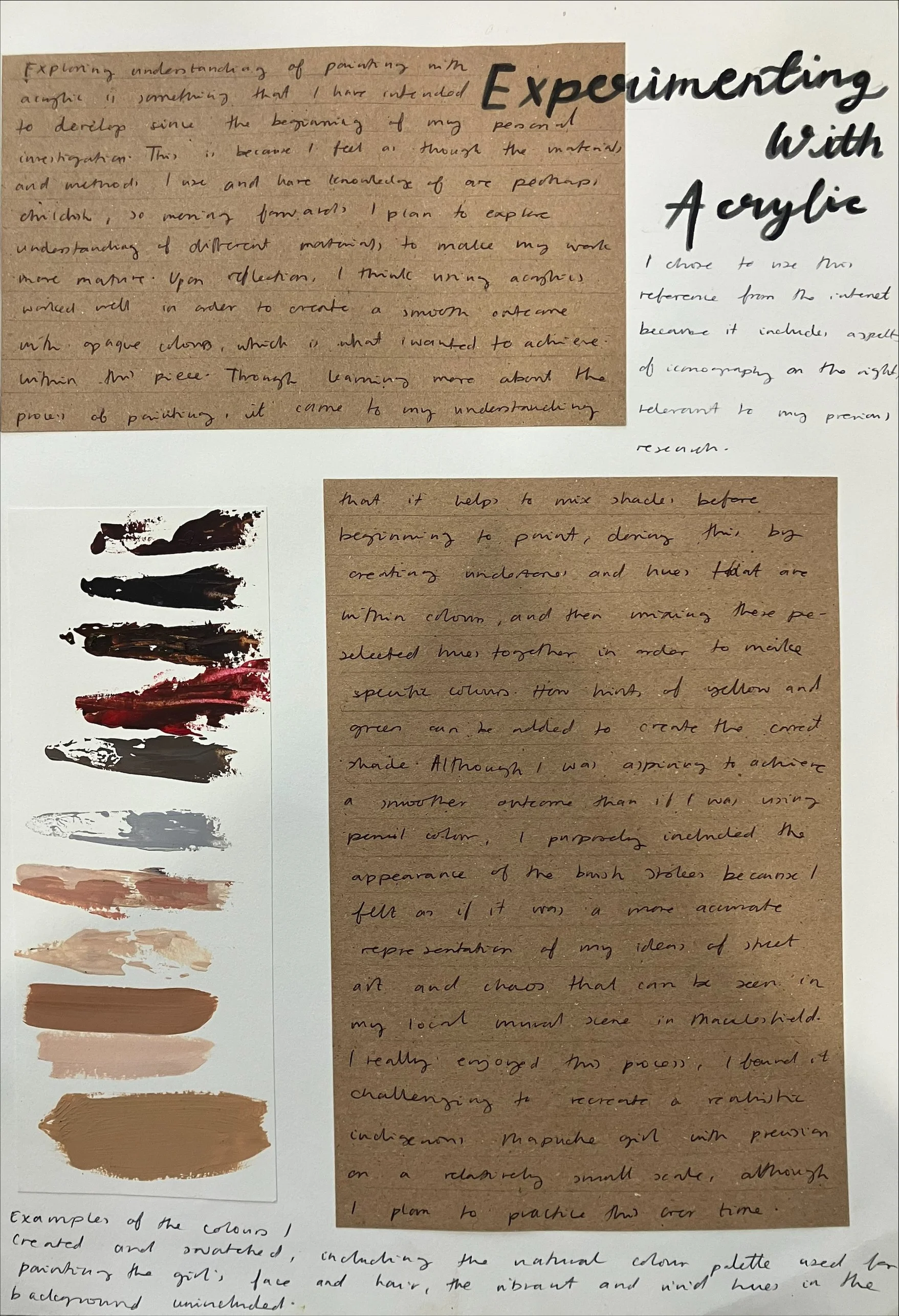 Improving acrylic painting - beginning to utilise an unblended way of painting figures that I later developed further into semi-abstract. Mapuche girl against rebellion symbol, expressing struggles of indigenous communities to gain rights as they are still seen as inferior in postmodern culture.